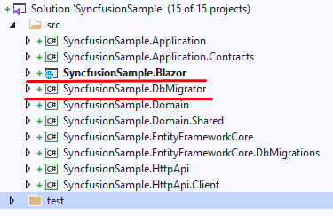 SyncfusionSample.DbMigratorto create the database and seed initial data (which creates the admin user, admin role, permissions etc.)