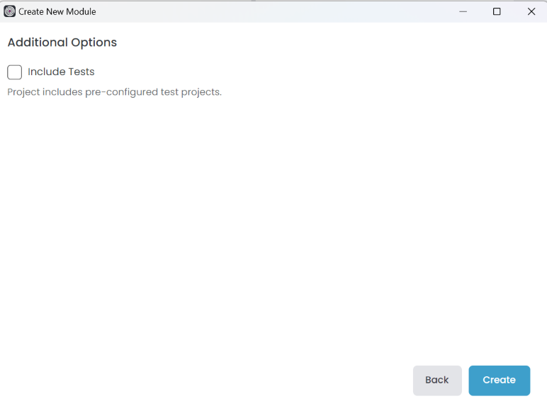 You can include or not include unit tests for the new module here. We are unchecking the Include Tests option this time to show a different structure for this example. Click the Create button to create the module.
