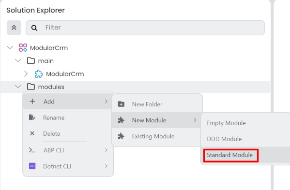 Now, you will create a second module for the ModularCrm solution through ABP Studio's Solution Explorer. This new module, called ModularCrm.Ordering, will handle all order related functionality in the application.