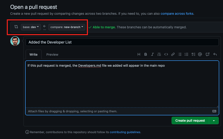 Before creating the pull request, make sure that the branch you created is making changes to the correct branch. After briefly describing your changes in the title and description, click the Create pull request button. This will send a pull request to the original repository. If the pull request is approved and merged by the community, your changes will also appear in the main repository.