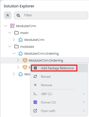 Return to ABP Studio, right-click the ModularCrm.Ordering package in the Solution Explorer and select the Add Package Reference command: