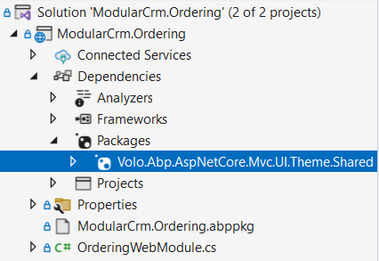 As you see in the preceding figure, the solution structure is very minimal. It also has a minimal ABP dependency. ABP Framework has hundreds of NuGet packages, but the ModularCrm.Ordering project only has the Volo.Abp.AspNetCore.Mvc.UI.Theme.Shared package reference: