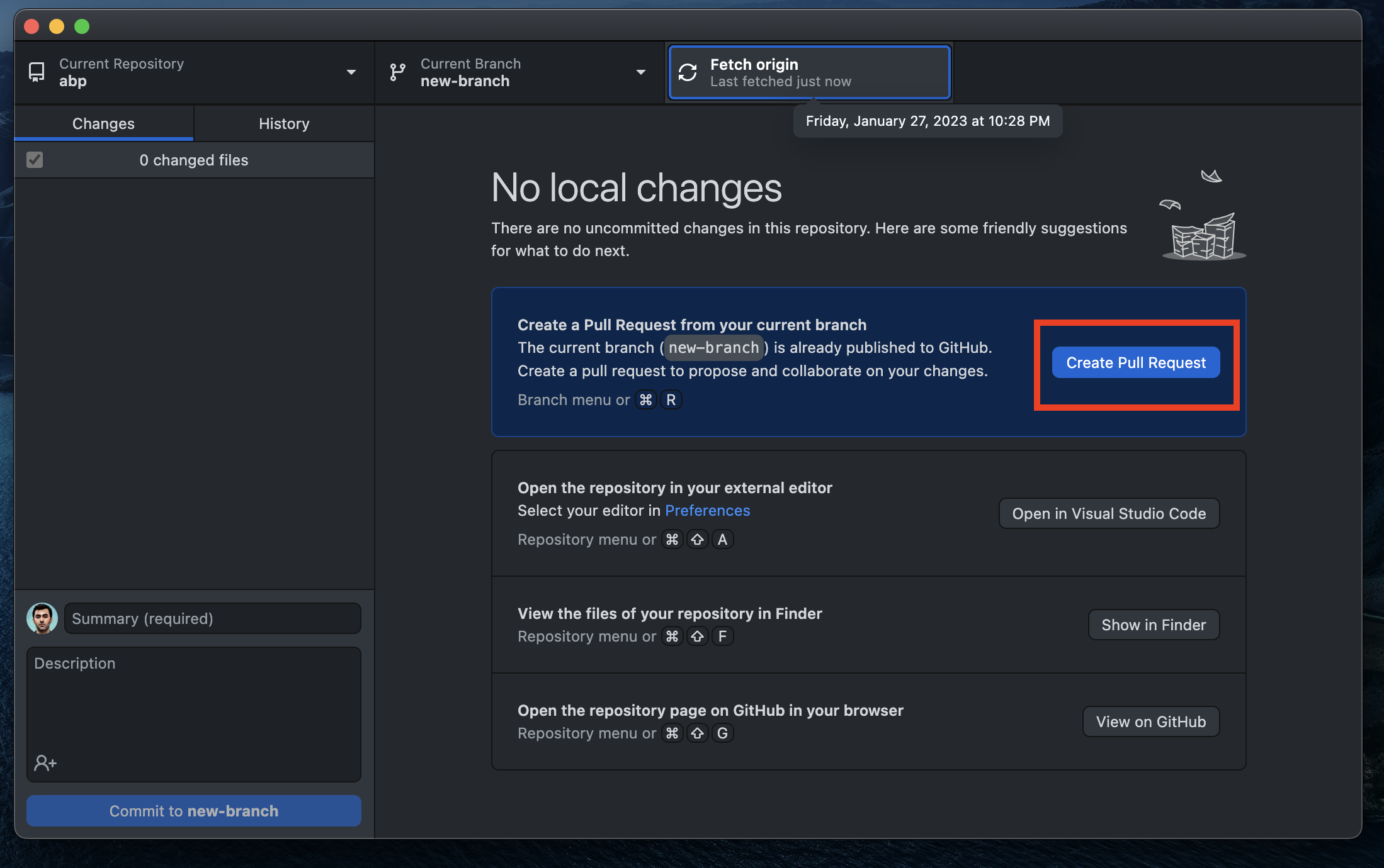 After the push, the pull request Create Pull Request button will appear on GitHub Desktop. Click it and create a pull request.
