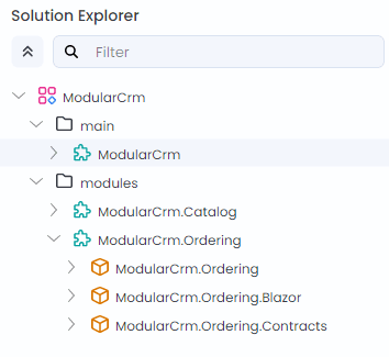 Here is the final solution structure after adding the ModularCrm.Ordering module: