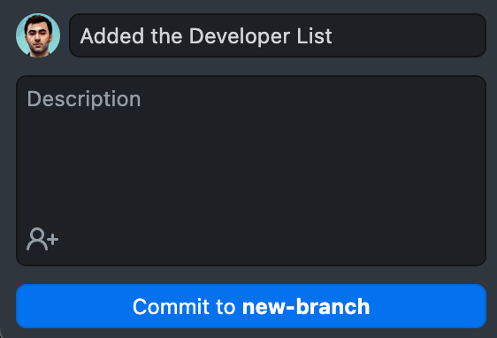 The commit operation is used to save the changes you have made. It is useful to commit after certain operations are done in the project. It is useful to write a short sentence describing what you've done for the changes made in each commit. Press the Commit to <branch-name> button to commit.