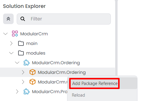 ModularCrm.Orderingmodule, select the Import Module command and import theModularCrm.Productsmodule), then install the package reference. In that way, it would be easy to see and keep track of inter-module dependencies.