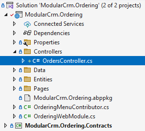 Open the ModularCrm.Ordering module's .NET solution, create a Controllers folder in the ModularCrm.Ordering project and place a controller class named OrdersController in that new folder. The final folder structure should be like that: