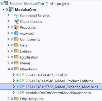Once you click the OK button, a new database migration class is added to the Migrations folder of the ModularCrm project: