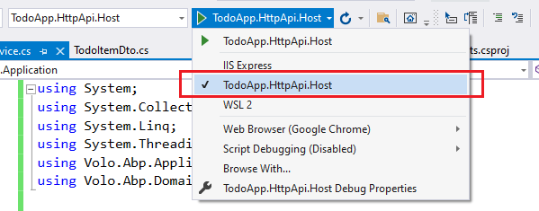 TodoApp.HttpApi.Host来替代IIS Express, 如下图所示: