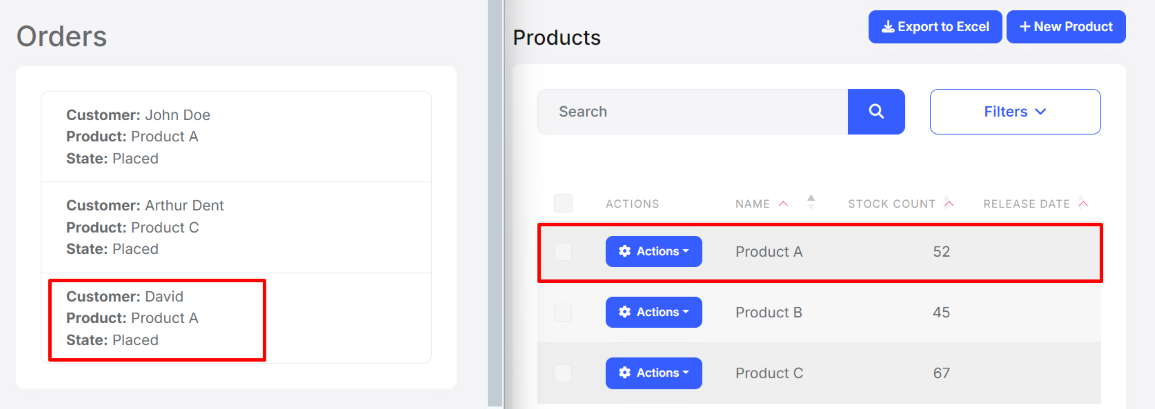 We placed a new order for Product A. As a result, the stock count of Product A is decreased from 53 to 52 and a new line is added to the Orders page.