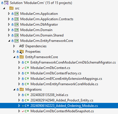 In this way, the Ordering module can use 'ModularCrmDbContext' over the IProductsDbContext interface. This part is only needed once for a module. Next time, you can add a new database migration, as explained in the next section.