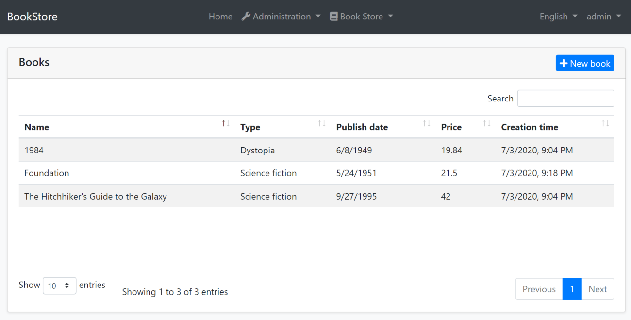 This adds a new button called New book to the top-right of the table:
