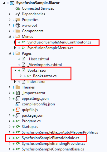 SyncfusionSampleBlazorModuleclass, call theAddSyncfusionBlazor()method from your project'sConfigureServices()method:public override void ConfigureServices(ServiceConfigurationContext context) { var hostingEnvironment = context.Services.GetHostingEnvironment(); var configuration = context.Services.GetConfiguration(); // ... context.Services.AddSyncfusionBlazor(); Syncfusion.Licensing.SyncfusionLicenseProvider.RegisterLicense("YOUR LICENSE KEY"); }To get the